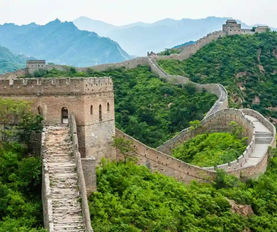 Grande Muraglia Cinese tra montagne verdi al tramonto, simbolo del viaggio organizzato in Cina